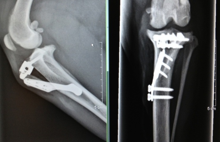 Det skadade korsbandets stabiliserande funktion ersätts genom en sk TTA-operation.TTA är en modern operationsmetod där benfästet till knäskålens raka band flyttas och fixeras med plattor, distanser och skruvar i titan (se bilden). Resultatet blir en stabilisering av knäleden som ersätter det skadade korsbandet. En stor fördel med operationsmetoden är att den är icke-invasiv, dvs man behöver inte öppna upp knäleden och förhindrar därmed att störning av den känsliga miljön i knäleden. Efter operation är rehabilitering (t ex sjukgymnastik och simning) viktigt för att knäleden ska återgå till normal funktion.